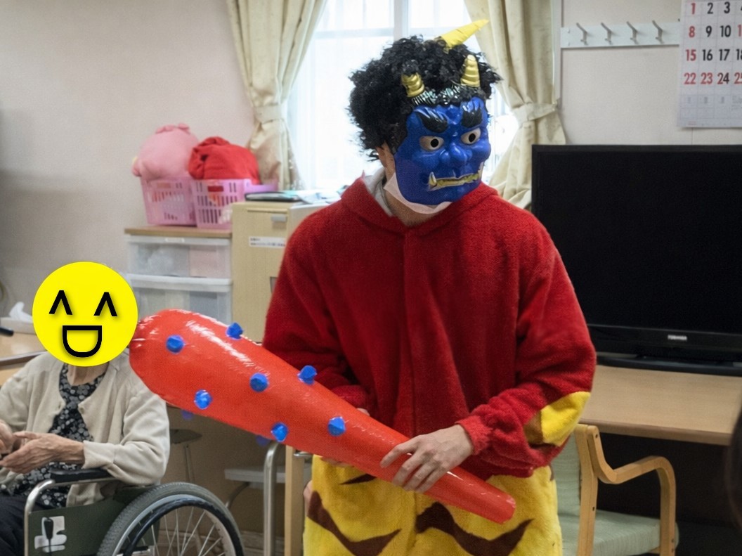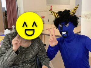 最初は、突如として登場した2体の鬼に驚き、思わず声をあげられるご利用者もいらっしゃいましたが、次第に笑顔が広がり、「鬼は外!福は内!」の掛け声とともに、元気いっぱい豆まきを楽しまれていました。鬼に扮した職員とのやりとりに、フロアは笑い声に包まれ、とてもにぎやかで和やかな時間となりました。