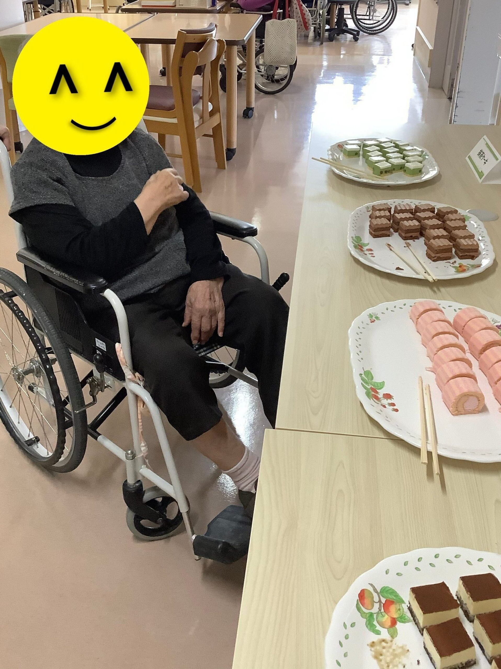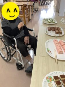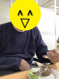 当日は、苺のロールケーキ、抹茶ババロア、ティラミスなど数種類のケーキが並び、どれにしようかと迷いながら選ぶ楽しさも感じて頂くことができました。「これにしようかな」「こっちもいいね」と笑顔で選ばれ、それぞれお好きなケーキをゆっくりと味わっておられました。食べ比べを楽しまれる方もおり、「甘くておいしいね」と会話も弾み、和やかな雰囲気の中で過ごされていました。